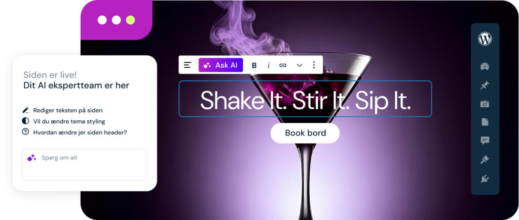 Du beskriver bare, hvad du vil, så hjælper AI dig hele vejen fra idé til færdig hjemmeside. Om du arbejder med WordPress eller vores egen hjemmesidedesigner er der AI-funktioner klar til brug!